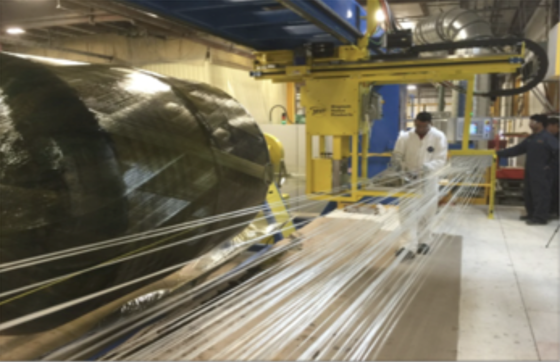 Before being wound with helical and hoop layers over the liner, the continuous strands of fiber are drawn through a bath of wet epoxy resin. Once the resin cures, the tank is then complete and ready for service.